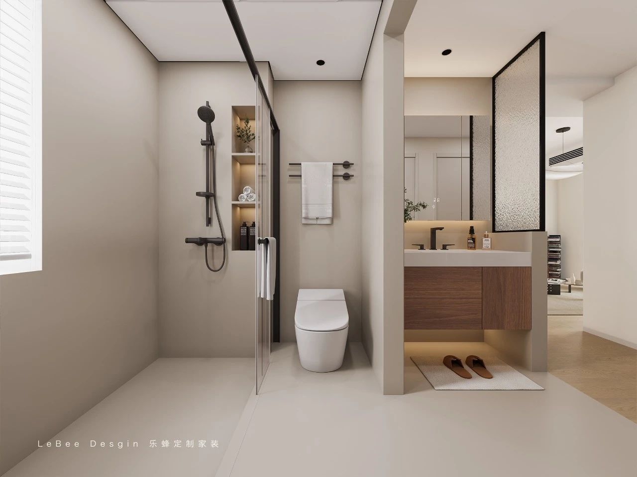 衛(wèi)生間采用洗手盆外置的設(shè)計(jì),將洗漱區(qū)與淋浴區(qū)、馬桶區(qū)分開,實(shí)現(xiàn)了干濕分離,更加方便日常使用。