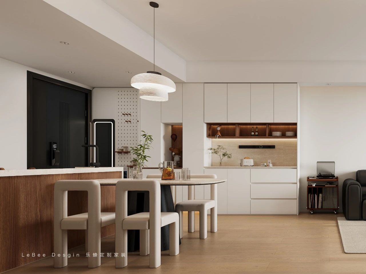 水吧臺(tái)的設(shè)計(jì)增加了操作臺(tái)面空間與收納空間,合理的行走動(dòng)線讓用餐環(huán)節(jié)更加便捷。餐桌穿插在島臺(tái)中間,提升了空間的層次感。