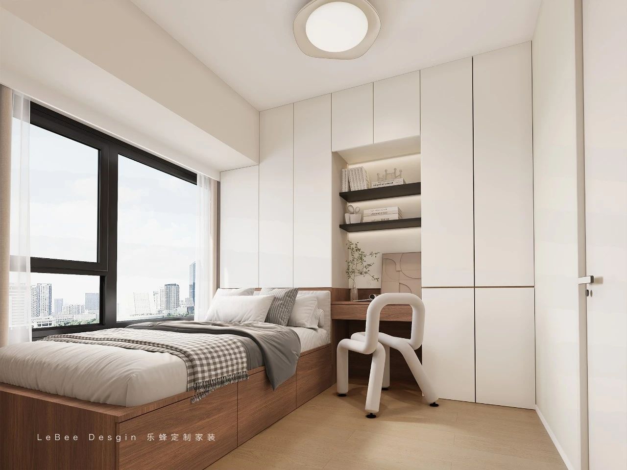 臥室整體以原木色和白色為主,胡桃木板墻木飾面點(diǎn)綴空間寬敞明亮。