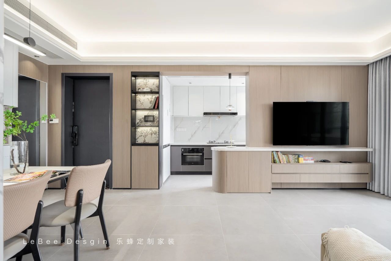 入戶進(jìn)門(mén),左手邊定制柜體,柜體采用開(kāi)放格設(shè)計(jì),極具現(xiàn)代感與藝術(shù)氣息,同時(shí)也方便展示一些精美裝飾品或常用物品。