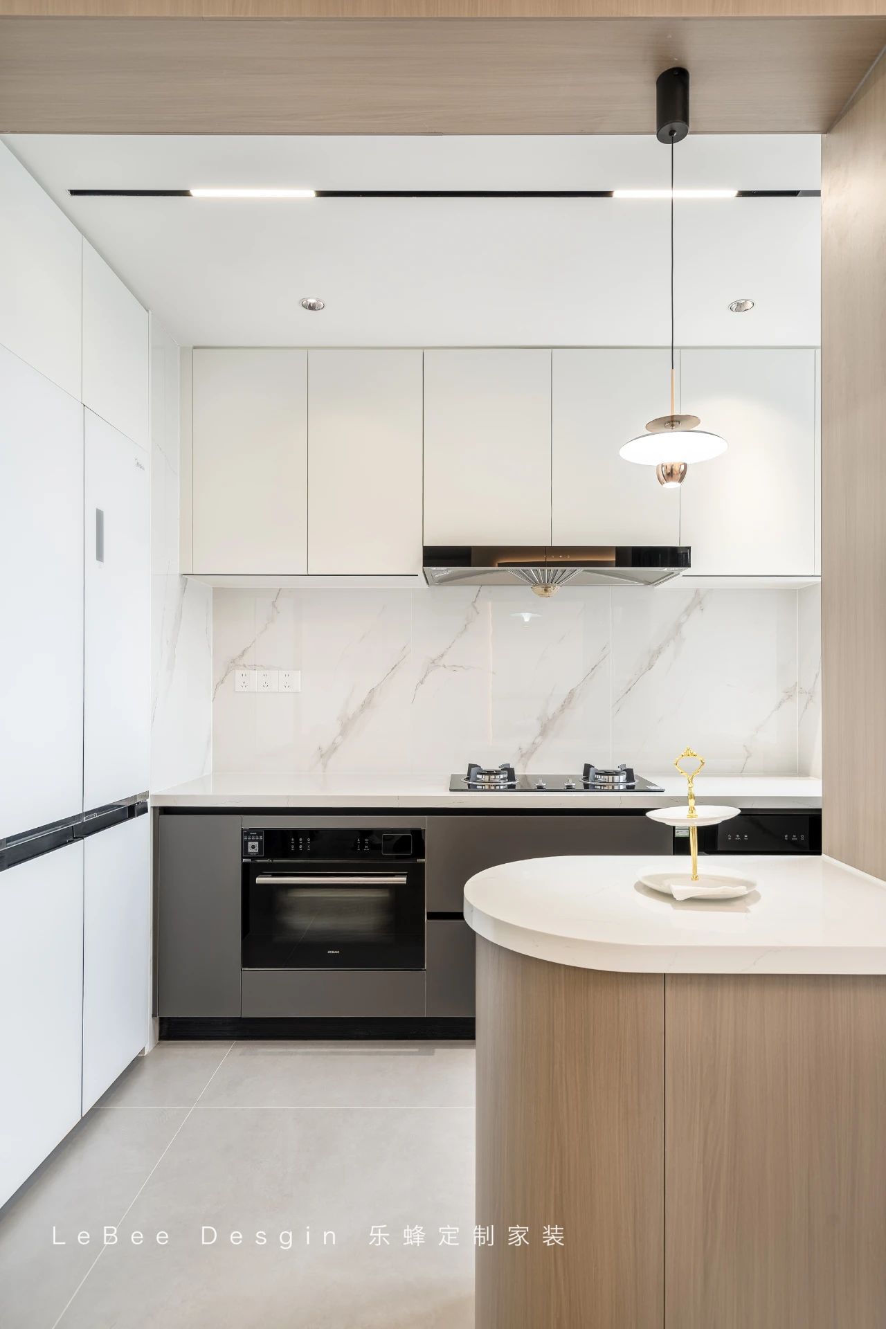 開(kāi)放式廚房客廳一體布局,打破了傳統(tǒng)的空間分隔,使動(dòng)線更加靈活順暢。操作臺(tái)延伸的吧臺(tái)作為視覺(jué)焦點(diǎn),既是簡(jiǎn)餐區(qū),也是日?;?dòng)的社交空間。