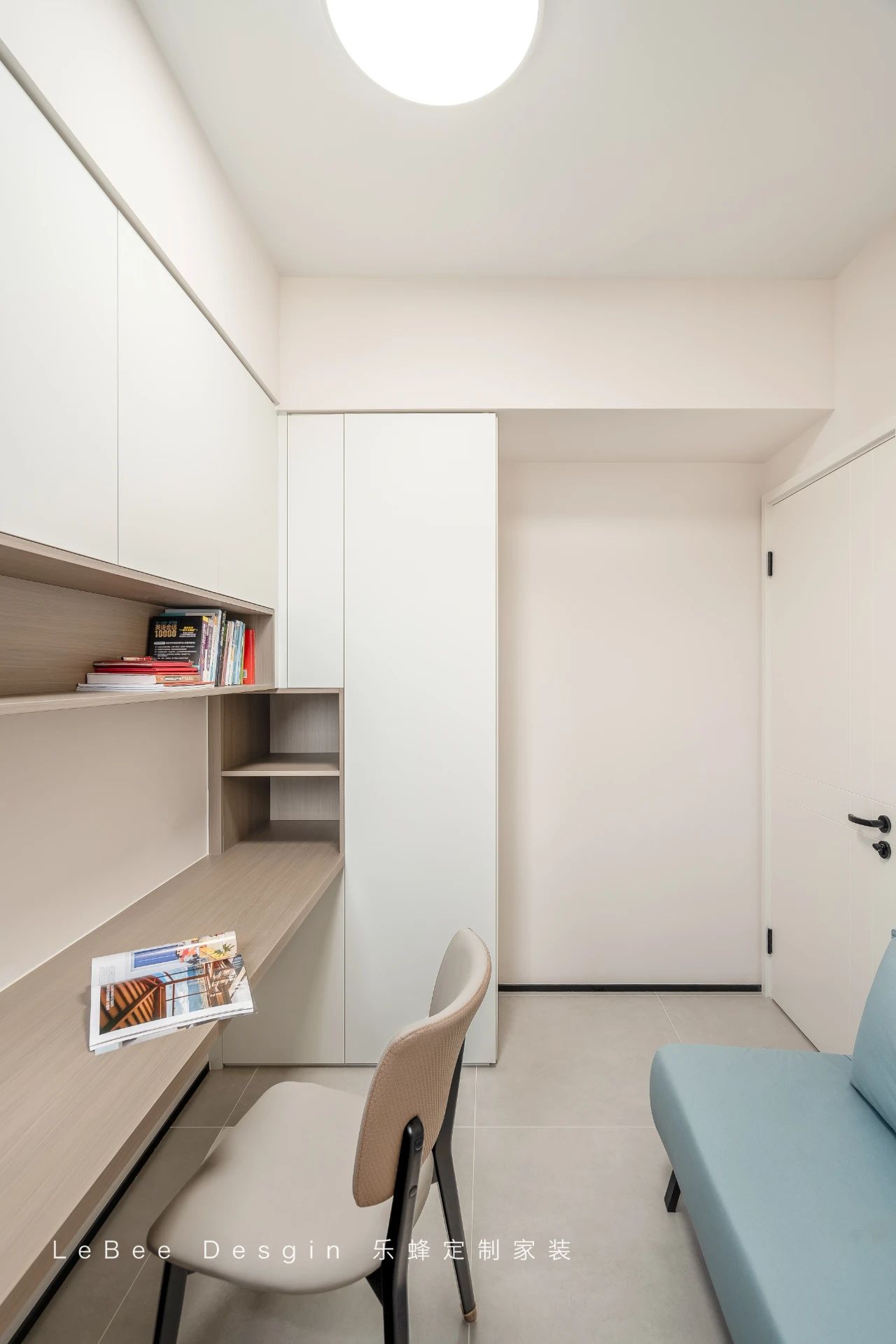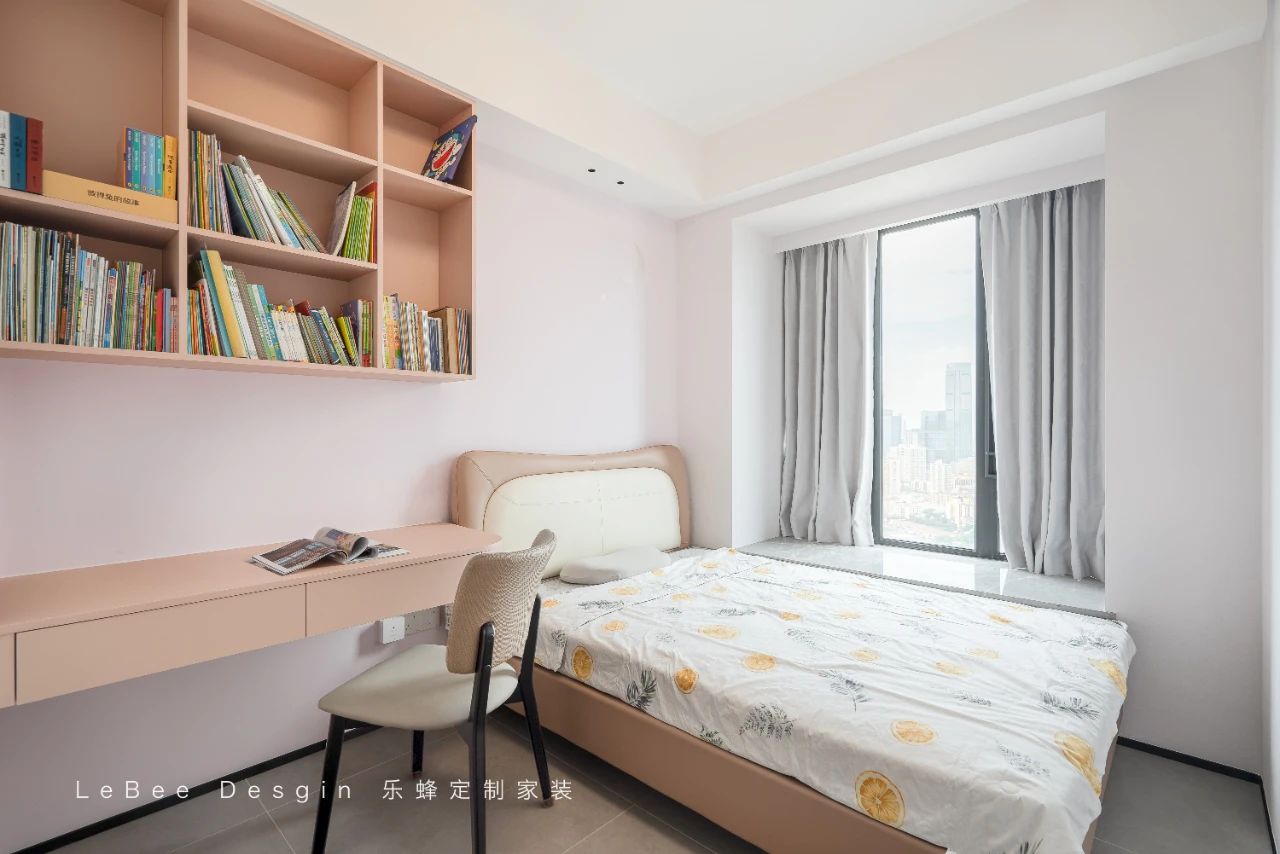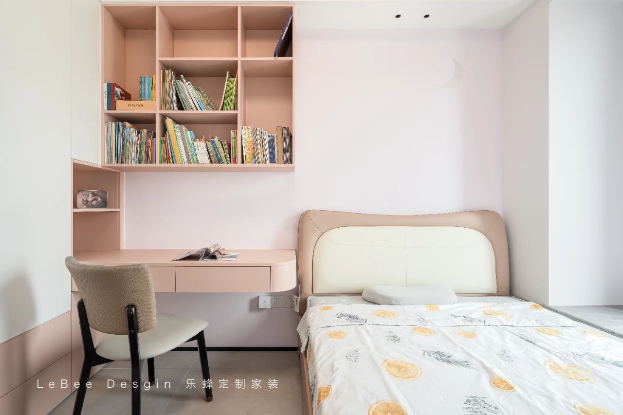 淡粉色的背景墻與淺橙色的墻面相得益彰,營(yíng)造出一個(gè)舒適的學(xué)習(xí)和休息環(huán)境。