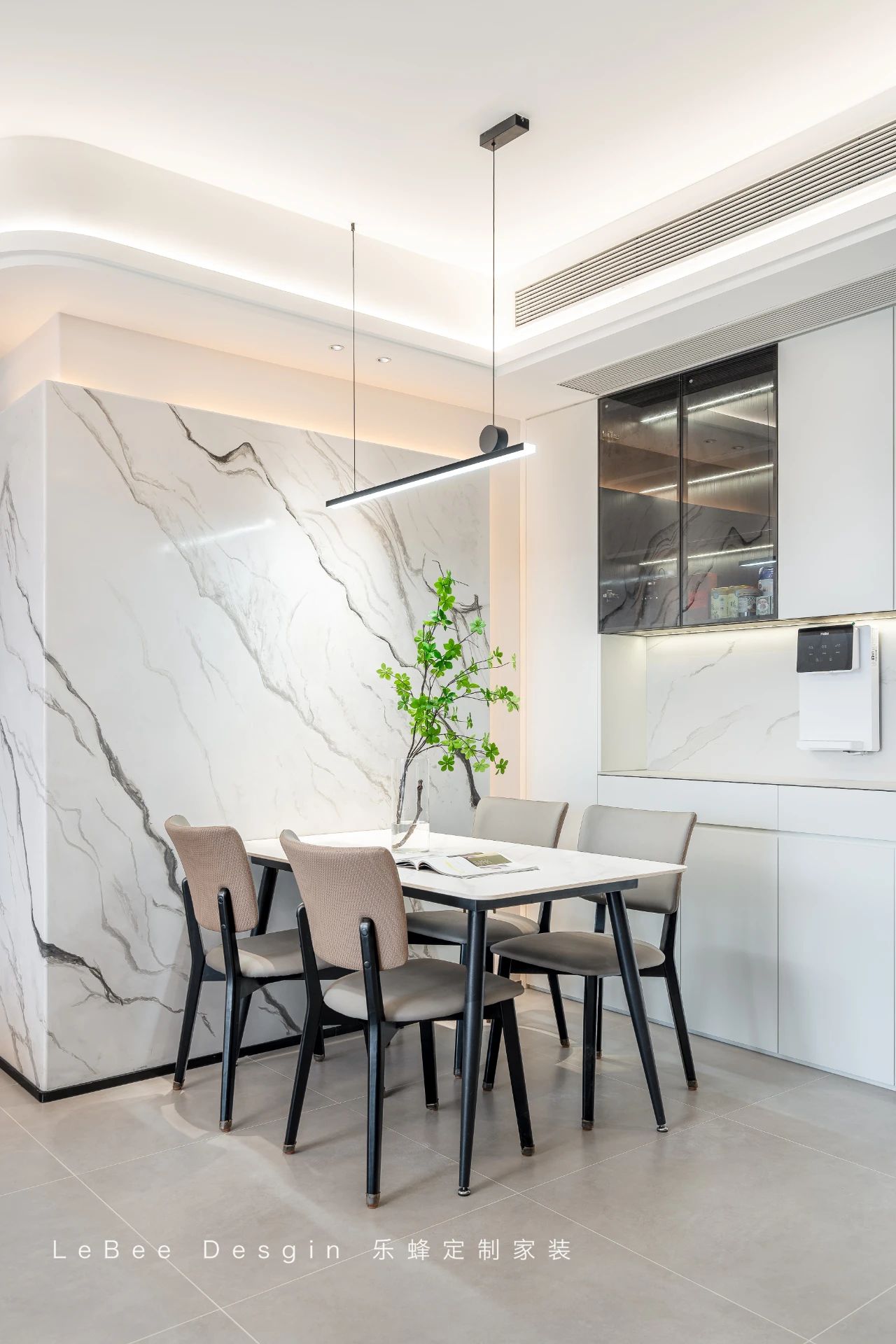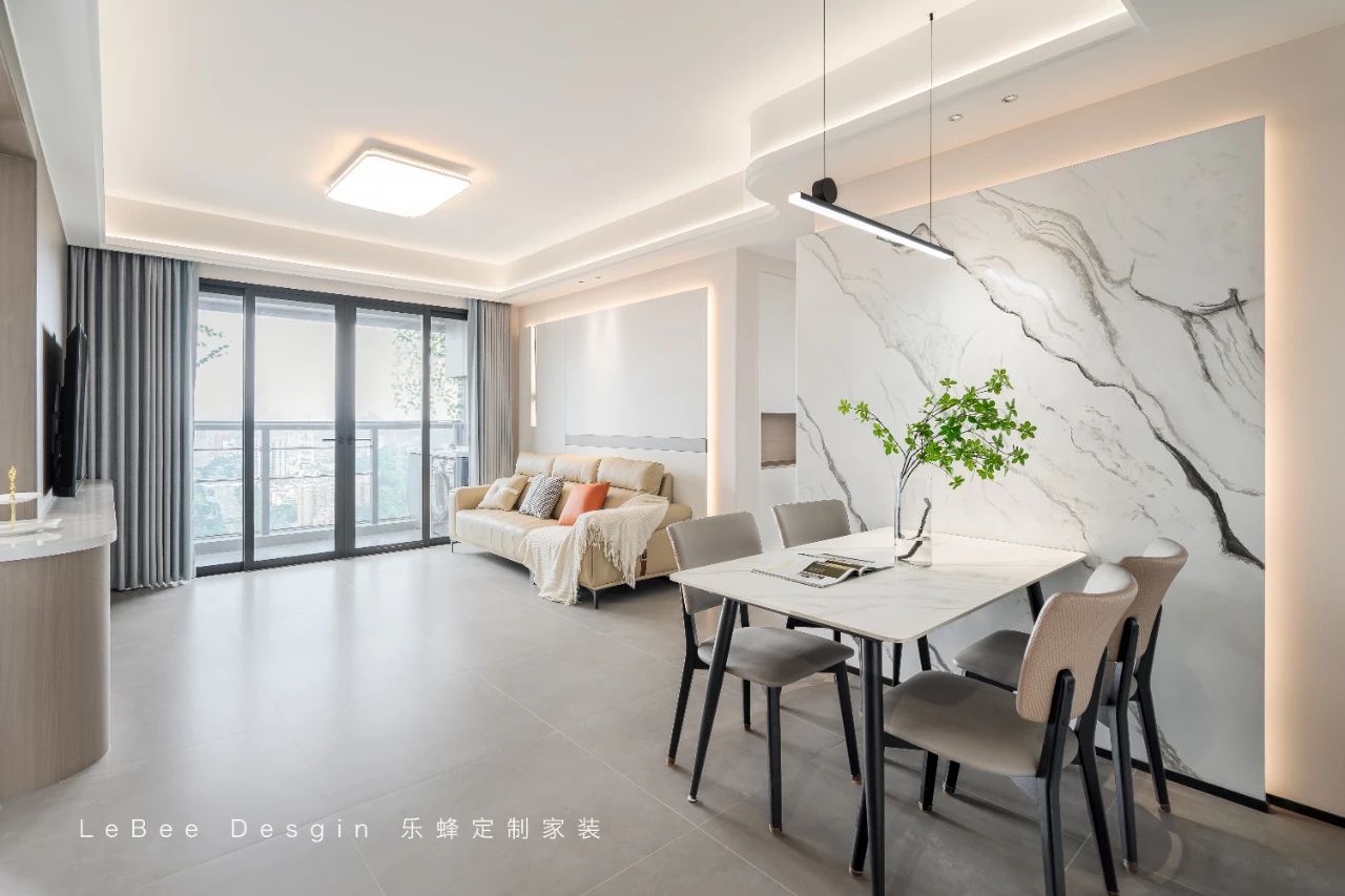 餐邊柜側(cè)面的開(kāi)放格設(shè)計(jì),大大增加了收納空間,出門(mén)拿取物品更加方便。整體柜門(mén)采用臻白,臺(tái)面是大理石紋理,搭配莫吉托巖板餐桌椅,讓空間瞬間充滿質(zhì)感。