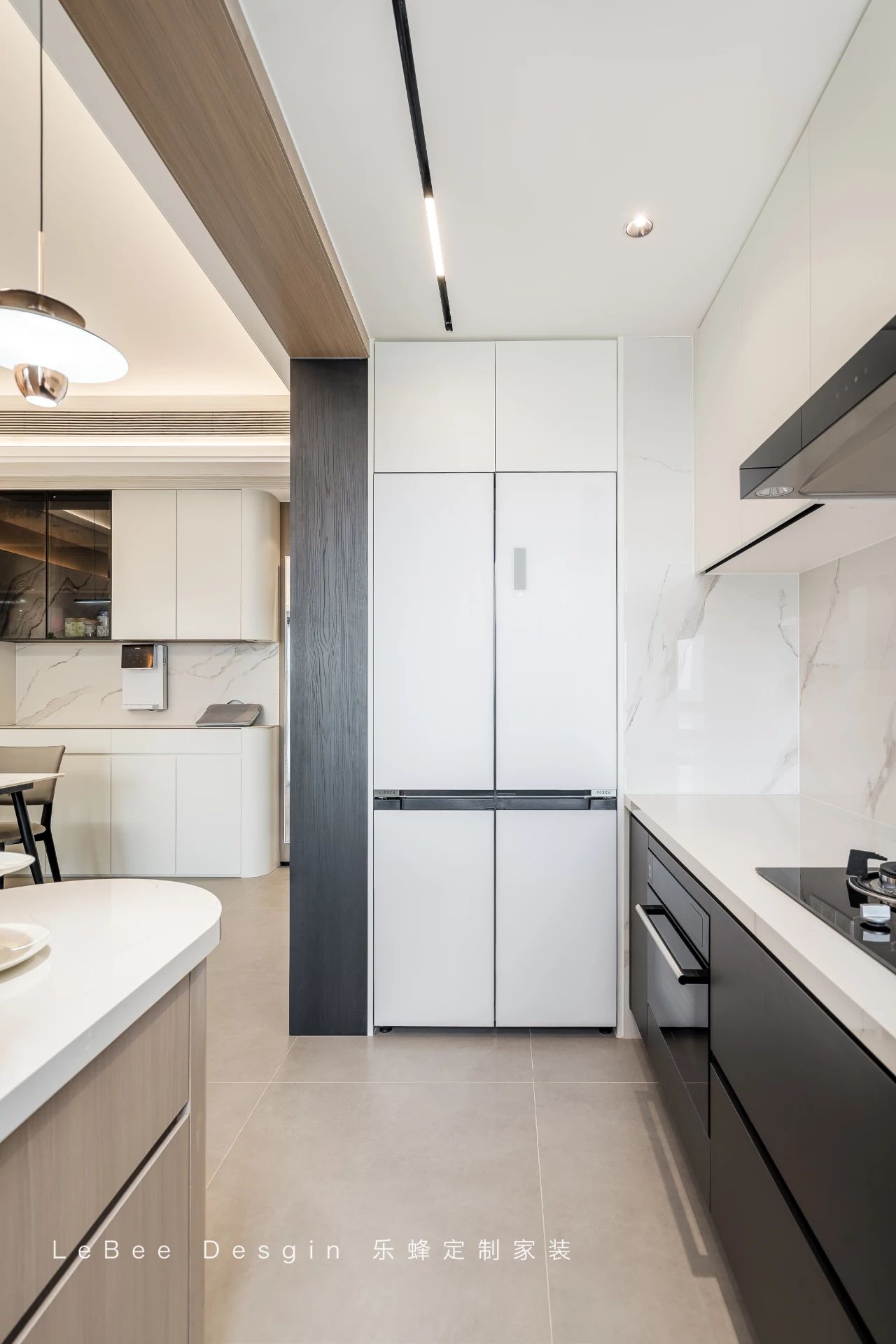 開(kāi)放式廚房客廳一體布局,打破了傳統(tǒng)的空間分隔,使動(dòng)線更加靈活順暢。操作臺(tái)延伸的吧臺(tái)作為視覺(jué)焦點(diǎn),既是簡(jiǎn)餐區(qū),也是日常互動(dòng)的社交空間。