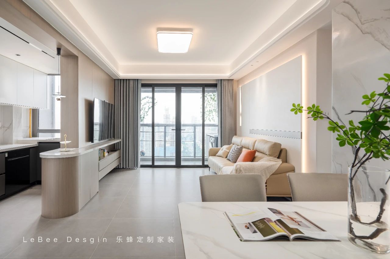 客廳陽(yáng)臺(tái)一體化設(shè)計(jì),瓷磚通鋪,讓空間更加開(kāi)闊流暢。全屋定制同色護(hù)墻板做延伸,與整體風(fēng)格完美融合。