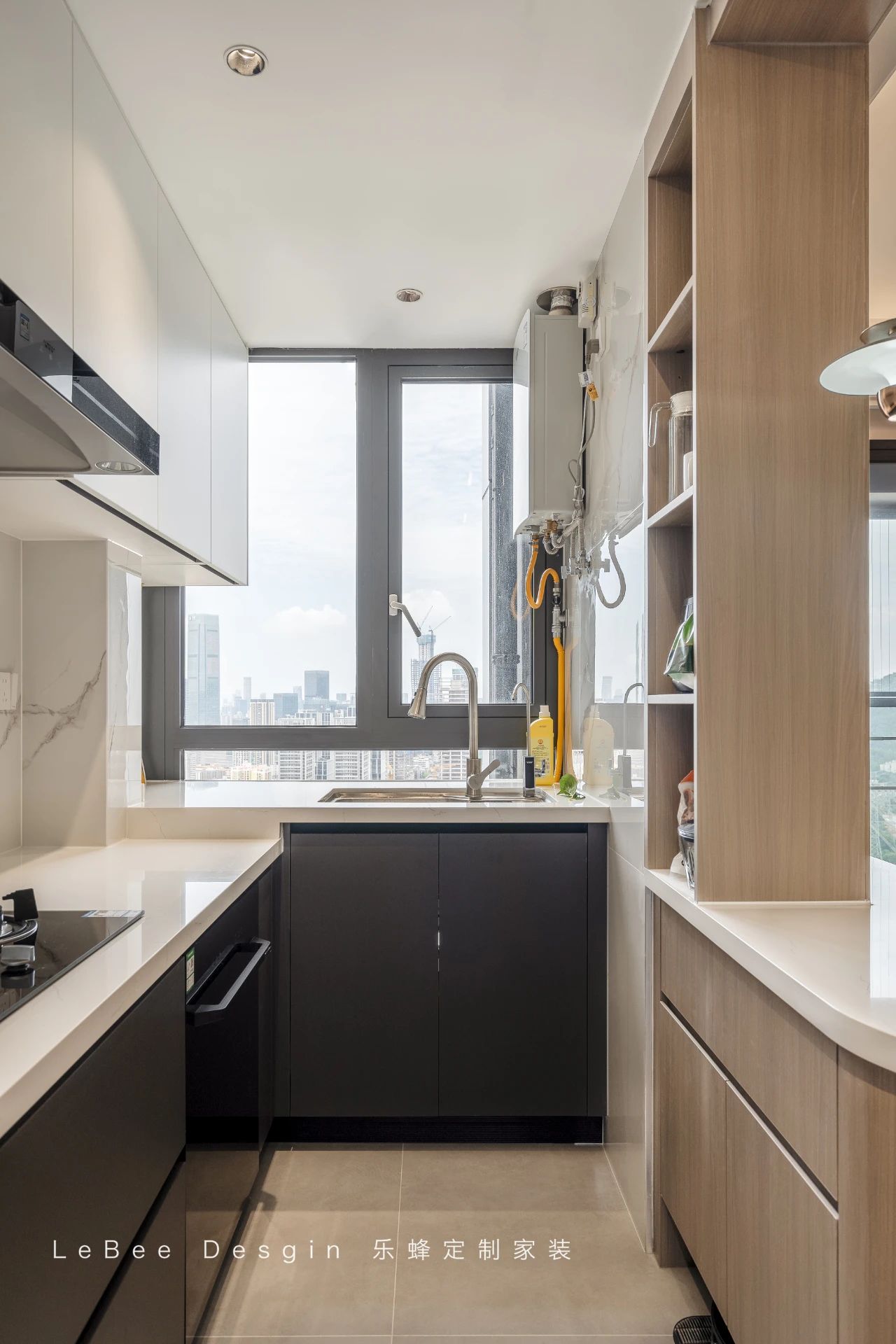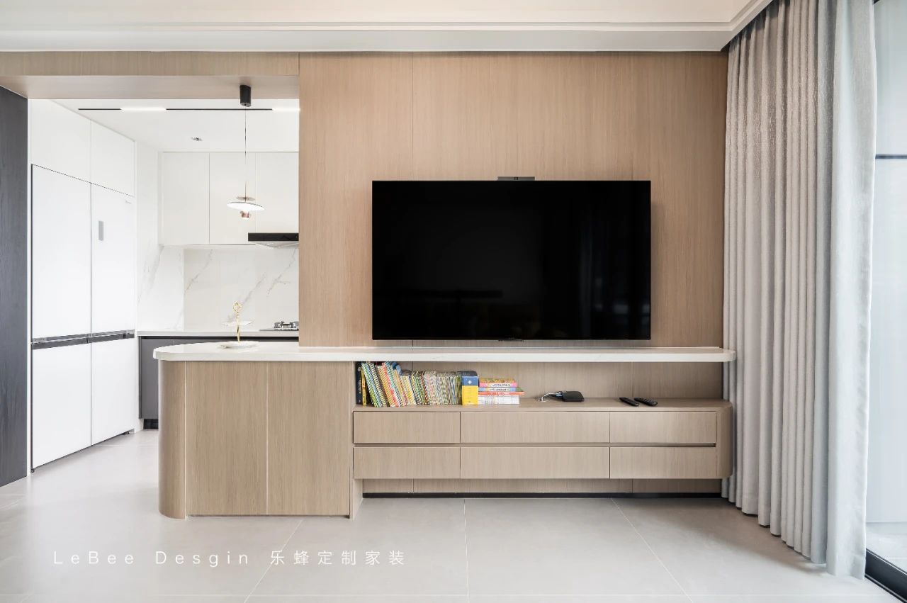 原木材質(zhì)的吧臺(tái)臺(tái)面與椅子呼應(yīng),溫馨又不失設(shè)計(jì)感。面和頂面被溫柔奶色覆蓋,采光、通風(fēng)、視野都在無(wú)形中放大。