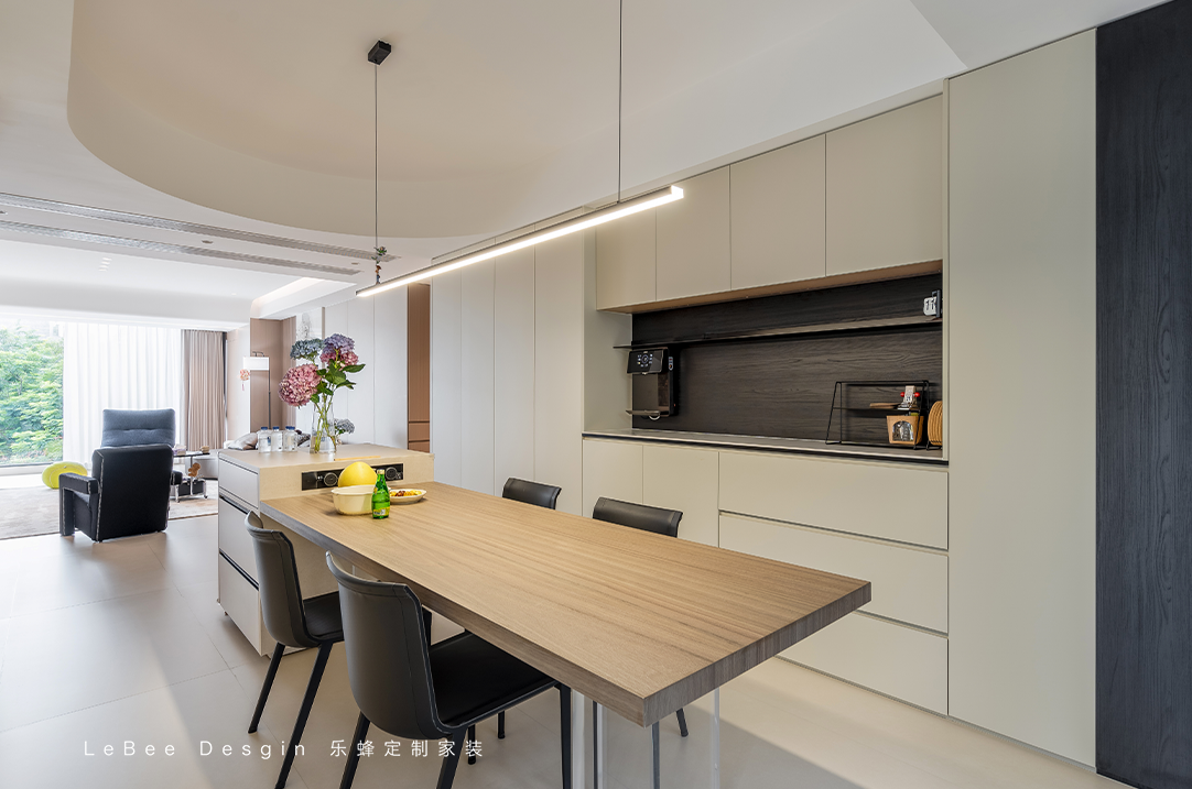 餐廳與客廳相連,采用開放式設(shè)計(jì),增加了空間的通透感。一側(cè)的餐邊柜采用淺色系搭配,使整體自然干凈的感覺增加了許多。