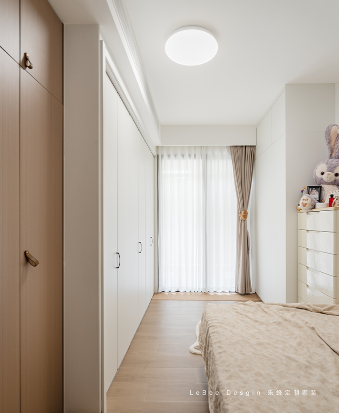 利用床尾打造一整排的淺白色衣柜,滿足日常收納需求的同時(shí),也讓整體色調(diào)更加協(xié)調(diào)統(tǒng)一~