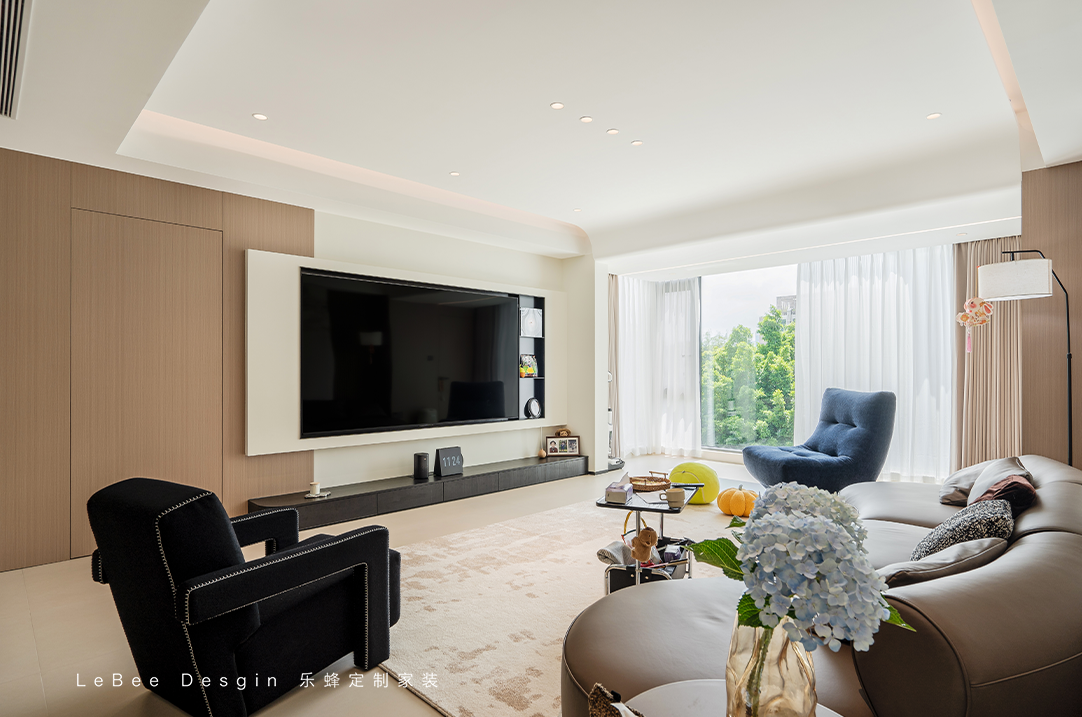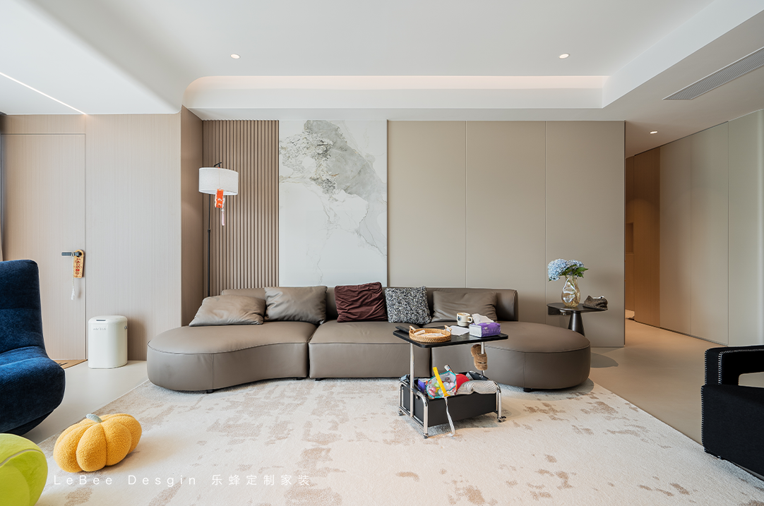 整體是一個(gè)大橫廳,淺色系搭配,墻面也不做如何復(fù)雜設(shè)計(jì),局部的黑咖色點(diǎn)綴便凸顯出了整體的層次感,看上去溫馨高級感十足。