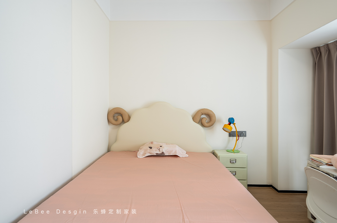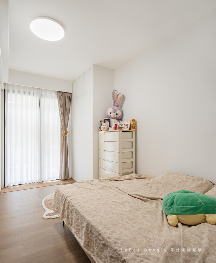 兒童房整體色調(diào)以淡雅的米白色為主,奶fufud超溫柔,給人寧靜舒適的感覺??繅Ψ胖靡粋€(gè)落地架子增加收納空間