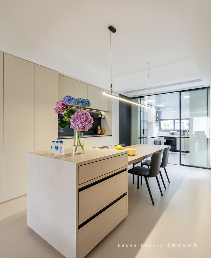 大量自然光線從廚房的窗戶進(jìn)入,給人明亮舒適的感覺餐廳和廚房用玻璃門隔,既隔絕油煙但廚房內(nèi)外的人還是可以進(jìn)行互動,廚房不再是一座孤島。