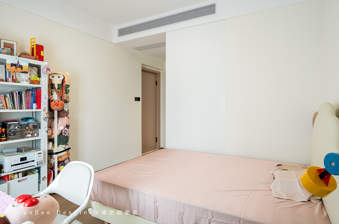 兒童房整體色調(diào)以淡雅的米白色為主,奶fufud超溫柔,給人寧靜舒適的感覺。靠墻放置一個(gè)落地架子增加收納空間