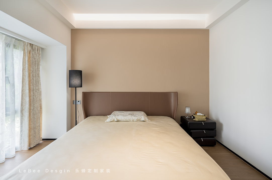 主臥室延續(xù)了整體的簡約風(fēng)格,以淺色色主,加上深咖色點(diǎn)綴,木地板營造出臥室的溫暖感,讓人感覺非常舒適。