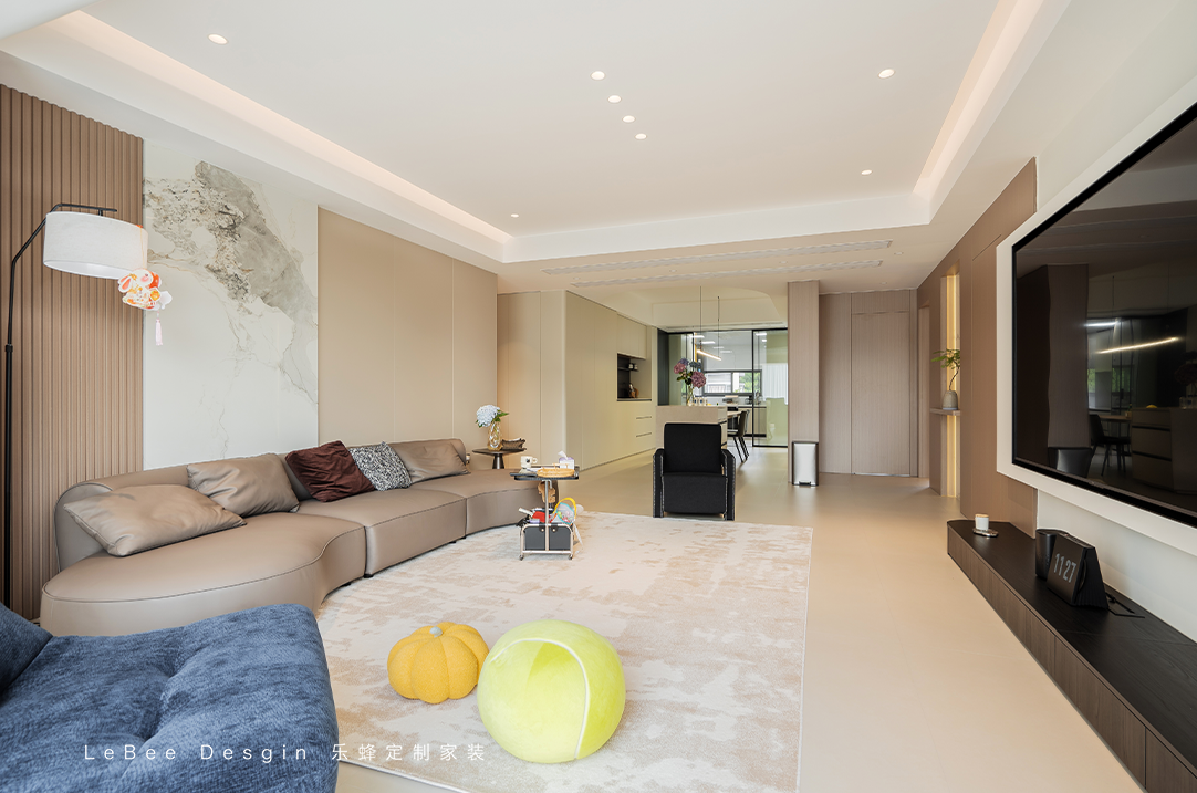 打通陽臺推拉門,讓陽臺融入客廳,通鋪柔光磚,顯高級也好打理,做無主燈設(shè)計(jì),空間更通透,很有氛圍感!