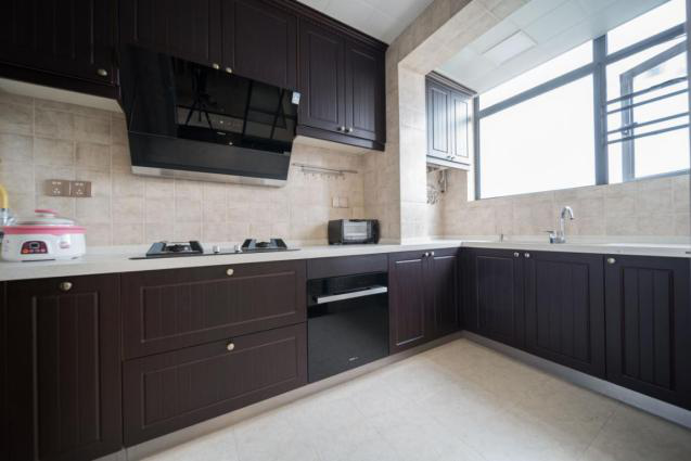 櫥柜搭配復古的廚具,增添了鄉(xiāng)村風格中的質(zhì)樸感。衛(wèi)生淋浴間收納較多,設置透明壁柜,后置花紋墻壁,盡顯華美之感。